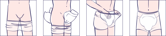 Изпънете анатомично оформената подложка между краката, като поставите по-широката част на продукта отзад (при Seni San for Men - по-широката част е отпред).